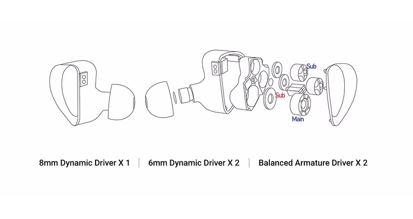 - • Три динамічні драйвери (3DD): Один 8-мм та два 6-мм динамічні драйвери забезпечують насичені, повноцінні низькі частоти.