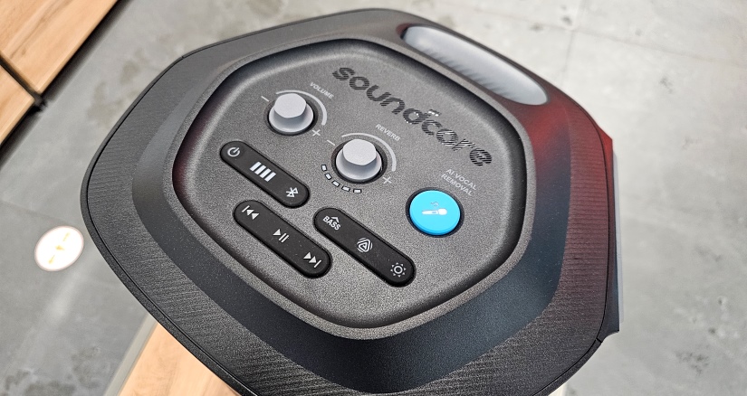 Зовнішній вигляд Anker SoundСore Rave 3S одразу дає зрозуміти, що колонка створена голосно звучати. Передня частина колонки закрита чорною металевою сіткою, на яку білою фарбою нанесено емблему компанії. Через сітку можна побачити три динаміки і один великий вуфер. При цьому кожний динамік красиво підсвічується (підсвітку можна змінювати – як кольори, так і режими). Зверху колонки знаходиться основна панель керування, де розміщено ручки керування гучністю та рівнем реверберації, кнопки увімкнення та блютус-з’єднання, кнопки навігації по трекам, індикатор заряду батареї (4 поділки), кнопки керуванням підсвіткою та рівнем басу, а також окрема синя кнопка для видалення, за допомогою штучного інтелекту, вокальної партії з треку (для функції караоке).
