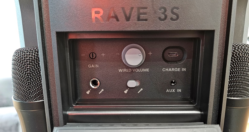 Зважаючи на наведені вище мої вимоги, мене цікавили й інші функції, аніж звичайна передача сигналу по блютус. Мені треба було одночасно озвучити голос, гітару та попередньо підготовлену фонограму (мінусовку). Розуміючи відсутність інших музикантів та інструментів, я заздалегідь записав деякі музичні партії, включаючи барабани, створивши ряд музичних файлів – під кожен твір окремий файл. Це зробило наш виступ значно насиченішим музикою. Для запуску фонограм приєднав через кабель до AUX-входу колонки плеєр FiiO M15S (на плеєрі виставив режим Line Out). Електрогітару напряму не можна було приєднати до колонки, тому використав портативний підсилювач VOX amplug2 AC30, який має вихід на навушники. Окремим кабелем з’єднав цей вихід з гітарним входом колонки, пересунувши відповідний перемикач на зображення гітари на задній панелі колонки. Можливо до таких лайфхаків з комутації можна висловити претензії, але обирати не було з чого. На щастя, комплектні мікрофони виявилися бездротовими і з їх підключенням проблем не виникло (в мікрофонах є можливість налаштування гучності). В результаті таких маніпуляцій з’явилася змога запустити фонограму, поверх неї грати на електрогітарі, виконувати пісні через один мікрофон та підзвучити шейкер (перкусія) через інший. Вказані під’єднання та органи керування колонкою дали змогу збалансувати рівень гучності кожного підключення та під час виступу залишалося лише виставити загальний рівень гучності, достатній для залу. Ну і автономність – незалежно від наявності іншої апаратури на сцені (не нашої), ми винесли колонку Rave 3S, провели виступ і забрали її зі сцени – без будь-яких незручностей для інших учасників заходу. Додам щодо автономності. За моїми замірами приблизно за 4 години активного використання колонки під час репетиції, індикатор заряду впав на дві поділки з чотирьох. Не впевнений на рахунок 12 заявлених годин автономної роботи, але годин на 7 – 9, ймовірно, можна розраховувати.