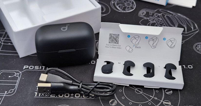 Тут все стандартно для навушників Soundcore. Біло-синя коробка з поліграфією, всередині кейс з навушниками, кабель Type-C і 2 пари силіконових накладок для тих, у кого навушники будуть погано триматись на вухах. Я їх не використовував, бо і без них навушники гарно фіксувались.