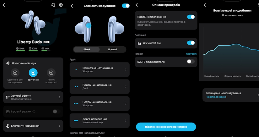 А от чого я тут не побачив – так це жодного вбудованого профілю еквалайзера, на якому б навушники звучали органічно (зазвичай у Soundcore це профіль Acoustic або Piano). Вони тут присутні, але звучання на них взагалі якесь доволі яскраве і кричуще. Тому завдяки HearID і звичайному ручному еквалайзеру вдалося підібрати адекватний режим. У ньому все звучало натурально і збалансовано.
