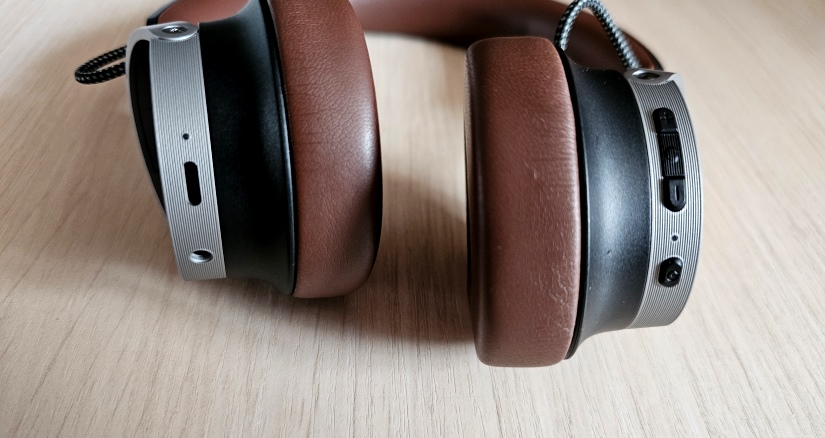 Чаші навушників розвертаються та займають пласке положення. Всередині чаш на сітці, що прикриває динаміки, великими літерами R та L вказані канали. Наголів’я складається з двох частин – з верхньої пластикової та нижньої з екошкіри. Зверху наголів’я в пластику «вибита» назва компанії, а в нижніх його частинах срібною фарбою нанесено логотипи. Особливістю ретро-дизайну є міцний дріт в тканинній ізоляції, що тягнеться від наголів’я до кожної з чаш. В моєму екземплярі цей дріт був несиметрично вигнутий, ніби знаходився в різних площинах, і це виглядало не дуже естетично (все відносно, можливо інші цього б і не помітили). На зовнішньому ободі лівої чаші розміщено роз’єм USB C та вхід 3,5 мм. Права чаша містить фізичні кнопки керування – одну продовгувату, яка складається з трьох частин та окрему мультифункціональну кнопку.