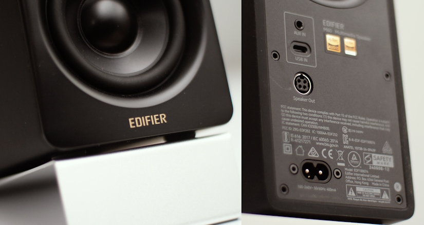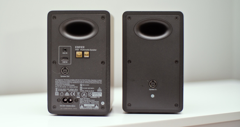 Edifier М60 це дуже компактні колонки, вони вдвічі менші за мої маленькі поличники Dali Oberon 1 (видно на фото). Так, Dali Oberon 1 вважаються маленькими поличниками. Розмір однієї колонки М60 можна порівняти з контролером Xbox. Зовнішній шар корпусу покритий дуже прикольним матеріалом, який схожий на гуму, мені особисто сподобалося те, як виглядають колонки і як вони відчуваються тактильно. Є чотири кольори на вибір: білий, чорний, дуб та фіолетовий. Якість складання як і матеріалу корпусу відмінні для своєї ціни, причепитися нема до чого. Усередині стоїть НЧ/СЧ драйвер розміром всього 3 дюйми потужністю 18Вт і твітер 15Вт. Верху правої колонки сенсорне керування та ззаду входи та виходи. Колонки мають стандартний дизайн фазоінверторного типу. Блок живлення знаходиться всередині, живлення від мережі 220В. Моє особисте зауваження, всередині колонок стоїть "стандартний" підсилювач класу D, який живиться 12В, чому не зробити USB живлення з "апконвертом" - я поняття не маю. Адже живлення від USB настільки спрощує та розширює сферу використання колонок. Як би там не було, колонкам потрібна розетка і від цього нікуди не подітися.