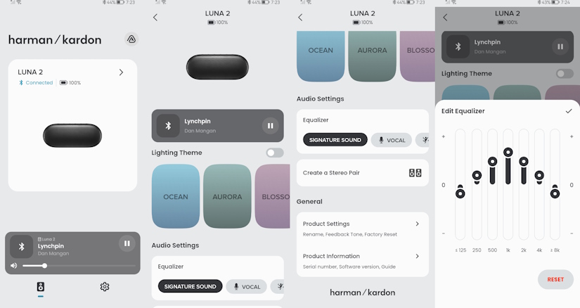 Помітна новинка це підсвічування. Я припускав що підсвічування підлаштовується під аудіо, насправді ні, воно анімується незалежно від звукового потоку, що на мій погляд трохи безглуздо. Мене особисто підсвічування не вразило, але безперечно комусь сподобається. Luna 2 підтримує AirTouch, за наявності двох однакових колонок, вони автоматично з'єднуються в стерео, якщо знаходяться поруч один до одного. Також колонка підтримує технологію Auracast, з'єднання будь-яких сумісних пристроїв у необмеженій кількості. Традиційно колонка працює з додатком Harman Kardon One. Додаток дозволяє вибрати та налаштувати підсвічування, а також налаштувати звук на свій смак. Що приємно, можна повністю відключити звук відгуку та підсвічування, що особисто я і зробив.