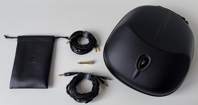 Комплект аксесуарів щедрий: кейс з твердим каркасом, два кабелі OFC в тканинному обплетенні (3.5 небалансний та 4.4 балансний), адаптер на роз'єм 6.3, м'який чохол зі шкірозамінника. Кейс досить великий, але якісний, не маркий, мені сподобався. Навушники у ньому можна тримати з підключеним проводом, це добре. Щодо стокових дротів – вони тонкі, у використанні слухняні, але за акустичною прозорістю, звісно, базові. Є простір для апгрейду, якщо захочете повністю розкрити музичний потенціал моделі, варто придивитися до сторонніх кабелів більш серйозного рівня, навіть від тих самих Meze. Навушникові конектори тут стандартні 3.5, підключення двостороннє, проблем з сумісністю не буде.