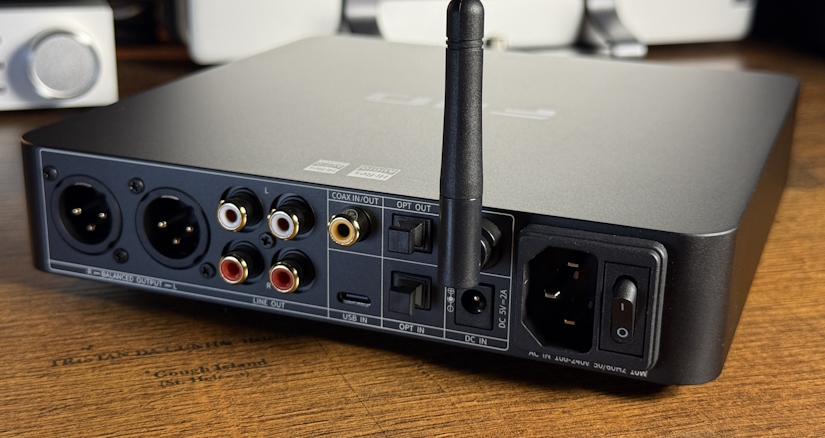 Ззаду ви знайдете вбудовану в корпус БТ-антену і цілий розсип можливих інтерфейсів для підключення пристроїв. Всі входи і виходи виконані з відмінною якістю притаманною пристроям FiiO. Всі підключення здійснюються з щільними кліками, які завжди радують наші технарські душі при під’єднанні пристроїв. Та головне для мене, що завдяки увазі до деталей тут не забули про таке просте, але таке потрібне вмикання живлення окремою кнопкою. Слід розуміти, що можливо використовувати пристрій в різних сценаріях через наявність окремого DC-IN, але такі пристрої є досить чутливою електронікою, а тому дуже бажано мати або розумні пристрої комутації живлення, які збережуть ваш Hi-Res сетап, або можливість жорстко обмежити подачу живлення прямо на пристрої. А краще обидва варіанти одразу.