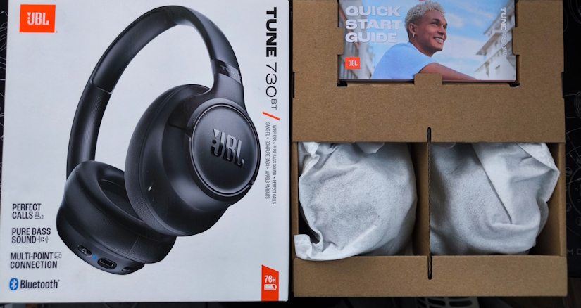 Оскільки модель бюджетна, то і пакування таке ж, бюджетне. Зовнішня коробка JBL Tune T730BT з кольоровою поліграфією, а от внутрішній лоток – звичайний перероблений картон. Але упаковано все дуже ергономічно. Сподобалось як зробили місце для інструкції, щоб вона не літала по всьому лотку.