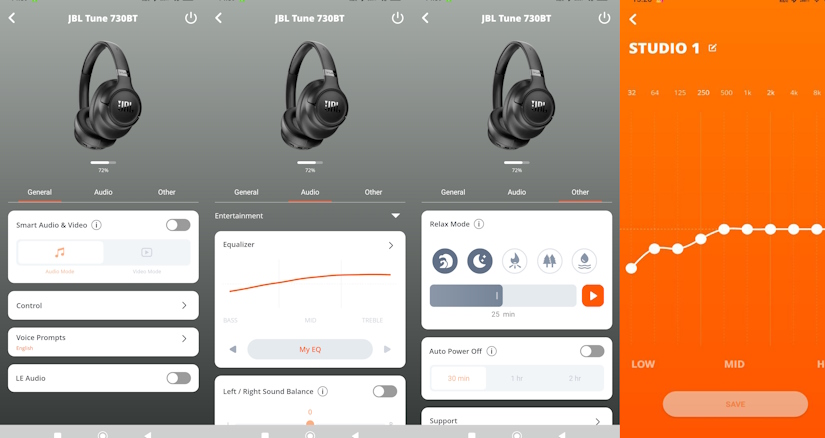 Навушники керуються через фірмовий додаток JBL Headphones, в якому можна обрати режими роботи, налаштувати кнопки керування чи змінити еквалайзер. І от за режим STUDIO прямо дуже дякую (але про це в розділі про звук).