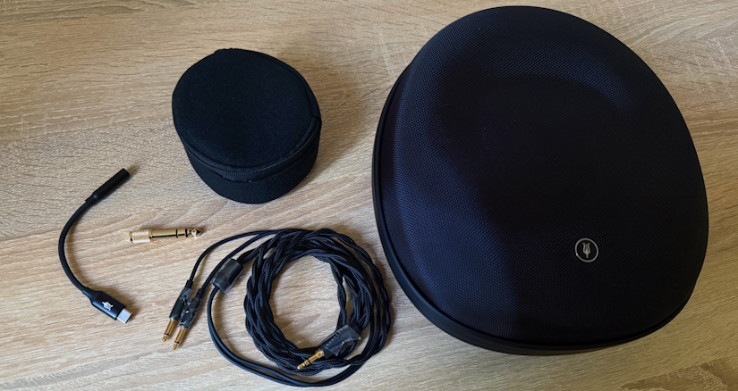 Перед нами велика квадратна коробка з зображенням навушників та художньою розповіддю про них. Всередині досить щедрий комплект постачання: гарний кейс з твердим каркасом, маленький тканинний чохол для проводів, кабель OFC довжиною 1.8 м в кевларовому обплетенні зі штекером 3.5 мм, перехідник на USB Type-C з вбудованим ЦАПом та підсилювачем, адаптер на роз'єм 6.3 мм.