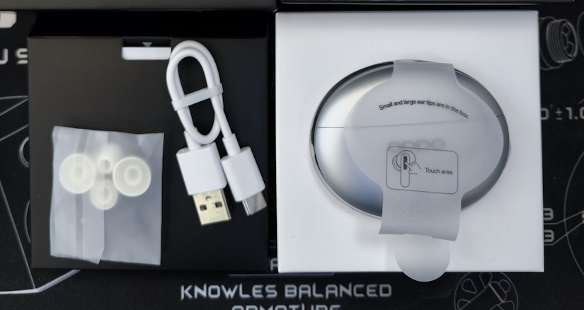 Нас зустрічає класичне пакування Oppo, яке ми бачили як в Oppo Air 4 Pro, так і в інших моделях. Насправді я буду часто згадувати Air 4 Pro, бо X3s дуже багато взяли саме від них. Це картонна коробка з поліграфії упакована у 2 шари. Нижній шар – коробка з аксесуарами, верхній – лоток з кейсом. В комплекті стандартні 3 пари насадок і шнур зарядки.