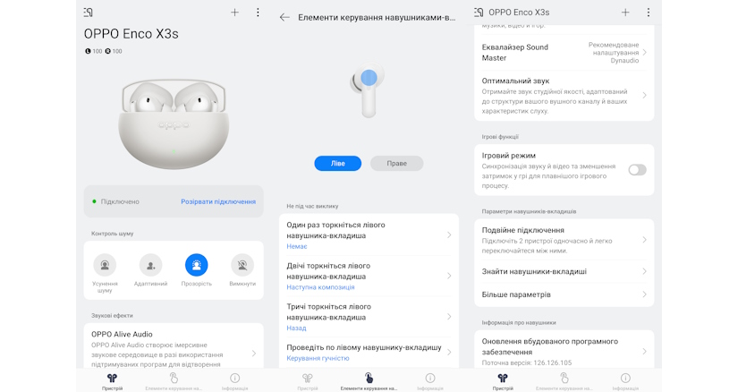 Oppo X3s керуються з додатка HeyMelody, в якому можна налаштувати режими ANC та прозорості, еквалайзер та багато іншого. Слабою стороною Oppo я б назвав відсутність великої кількості пресетів, бо далеко не кожен зможе підлаштуватись в ручному режимі. Але присутній режим підбору еквалайзера під ваш слух. Працює нормально, але саме у випадку з X3s йому не вистачає діапазону змін по частотах, щоб налаштувати адекватне звучання (але про це в розділі про звук)