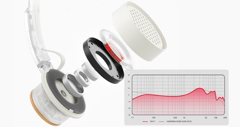 Попри свій витончений вигляд, EH11 приховують у собі потужну акустичну систему. В основі лежить високоякісний 40-міліметровий динамічний драйвер із великим ходом діафрагми. Завдяки спеціальному налаштуванню інженерам вдалося подолати типовий недолік накладних навушників ‒ дефіцит низьких частот, забезпечивши глибокий та енергійний бас.