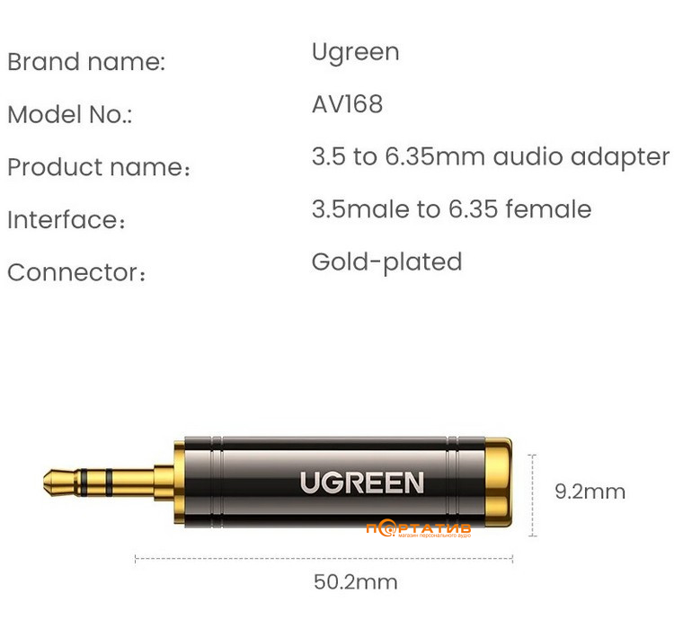 Адаптер дозволяє легко підключати смартфони, планшети, iPod або навушники зі стандартними стереороз'ємами 3.5 мм (1/8 дюйма) до аудіопристроїв з роз'ємом 1/4 дюйма за допомогою кабелю з роз'ємами 1/4 дюйма тато-тато.